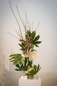 The Sogetsu School is distinguished by its free style and abstract arrangements which use objects of sculptural intent and character. The three main elements designers use are line, mass, and color, with an emphasis on the designer’s individual artistic expression and creativity.