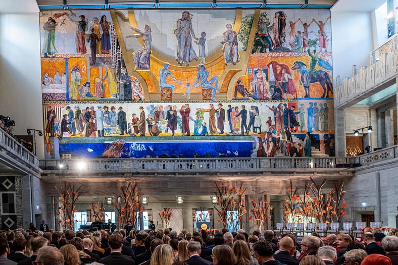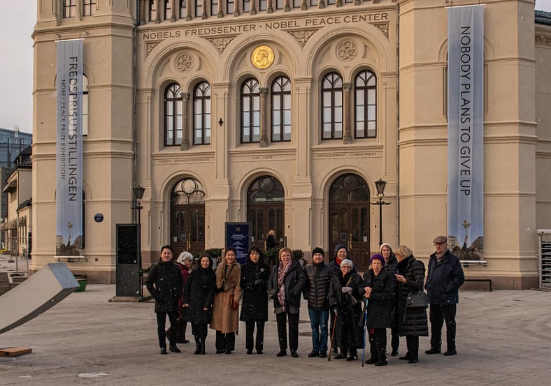 Concurrent to its peace programming in London, Japan Institute hosted a patron tour including Portland Japanese Garden Board Members, donors, and partners to experience more programs and build the relationships that will help advance our mission of inspiring harmony and peace. At the conclusion of the London Peace Symposium, the patron tour continued to Oslo, Norway. There, both Japan Institute staff and their fellow travelers visited the Nobel Peace Center and attended events highlighted by the Nobel Peace Prize Award ceremony held on December 10. Below is a collection photos of the events and gatherings that took place in Norway.