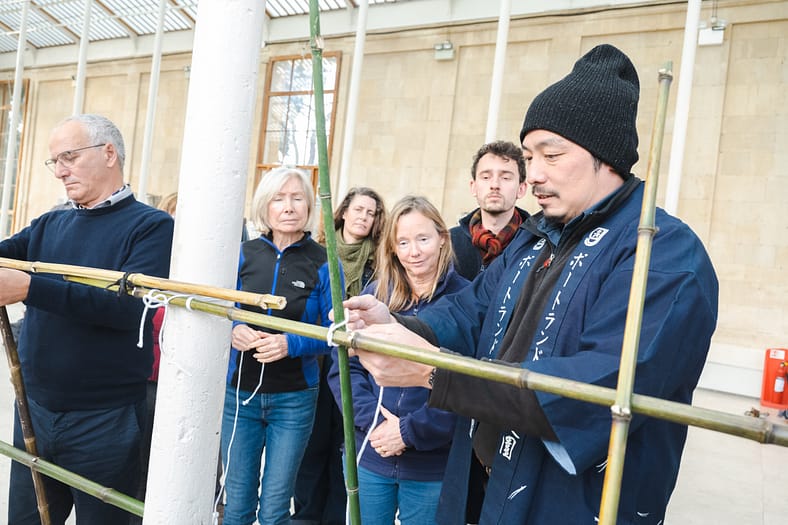 As part of the peace programming, Japan Institute and Royal Botanic Gardens, Kew held a Japanese Gardening Workshop for a small group of gardening professionals and enthusiasts. Japan Institute’s Chief Curator, Sadafumi Uchiyama, and Garden Curator, Hugo Torii, were joined by Jake Davies-Robertson, Arboretum Supervisor for Royal Botanic Gardens, Kew, in leading a hands-on maple and pine tree pruning workshop as well as a bamboo fence-building workshop.