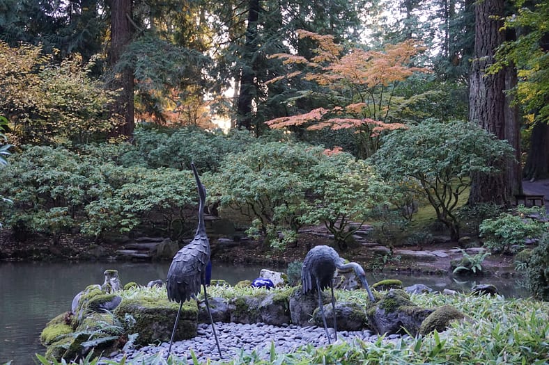 There are still some animals yet that are cared for in Portland Japanese Garden—our beautiful koi that grace the waters of the Strolling Pond Garden in brilliant flashes of orange, gold, silver, white, and black. Beyond them, the only animals that patrol the grounds are wild ones. Several birds including robins and juncos can be seen enjoying the mossy grounds or even perched on our signs. One may also see squirrels, slugs, and even frogs every now and then. The presence of animals is also symbolized throughout the Garden, such as the Wet Heron Lantern in the Flat Garden or the mythical koma inu that sit ahead of the Nezu Gate.
