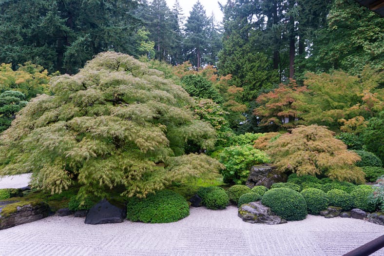 There are several elements to this space that contribute to its stunning beauty. Among them is the larger of the Flat Garden’s two Japanese maples on its northern side. Symbolic of autumn splendor, this tree arrived at Portland Japanese Garden in November 1972, a generous donation from Mrs. Brown of Sellwood. Alongside a slightly smaller variation, these maples elegantly preserve the memory of their predecessor, the first tree planted in the Garden which had rotted.