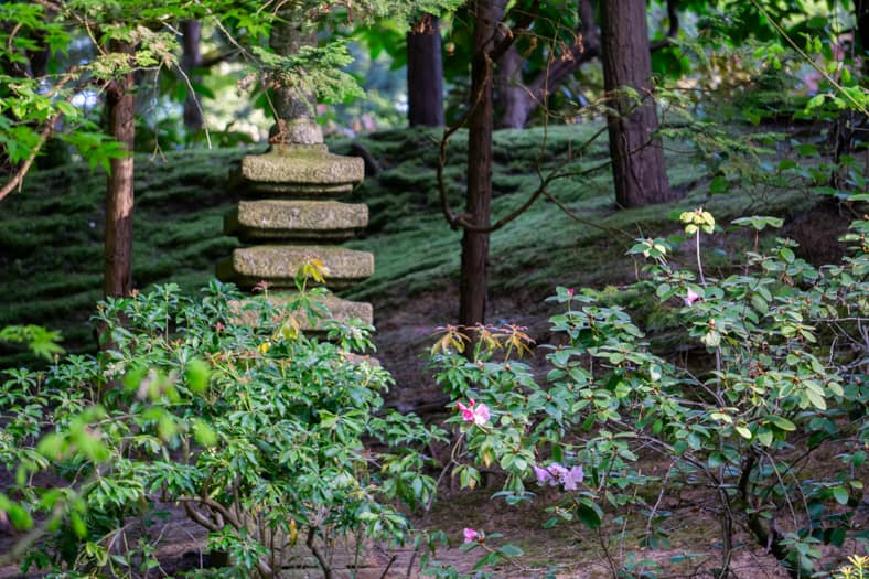 The space is approached by walking a long and narrow path that slopes down by a hillside of matcha-green moss and a small and humble stone carving of a jizo, a Buddhist figure seen as a protector of travelers and children. After passing through a wooden gate with asymmetrical doors (one wide, one narrow), new lands are unveiled. Maples are delicately layered over gentle waterfalls, languid ponds, and bubbling streams. A series of winding stairs takes visitors past camellia and rhododendron. Interestingly, there are stone lanterns within, but most are so inconspicuous that they may fail to catch the eye. Two areas with long wooden benches hug its side before the path winds to a machiai (sheltered waiting area) that showcases the depth of the space and treats listeners to the sound of coursing water. Finally, an ascent through azaleas takes one by a distinctly different karesansui (raked gravel garden) before it places people on pathway adjacent to a pavilion.