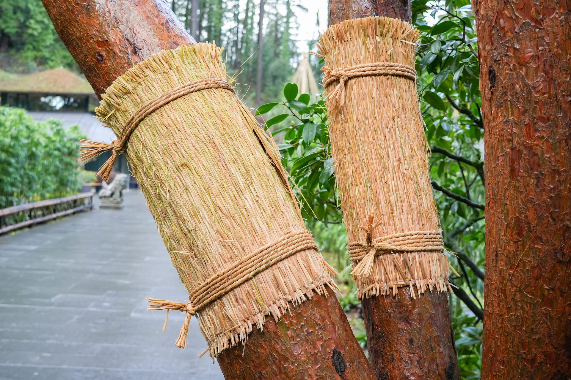 Yukizuri have been installed in two locations this year. Trees in the Flat Garden, including its weeping cherry and maples, feature yukizuri with ropes tied to spikes driven into the raked gravel. In the Cultural Village, ropes will be tied directly to tree limbs. While Portland’s typical winters don’t bring the heavy snowfall seen in Japan, these additions serve as an aesthetic touch, showcasing the craftsmanship and cultural traditions of Japanese gardens. The Garden’s rice straw ropes, reminiscent of shimenawa, are favored in Kanazawa and used in Shinto rituals. These ropes symbolize the border of sacred spaces and act as a ward against evil spirits.