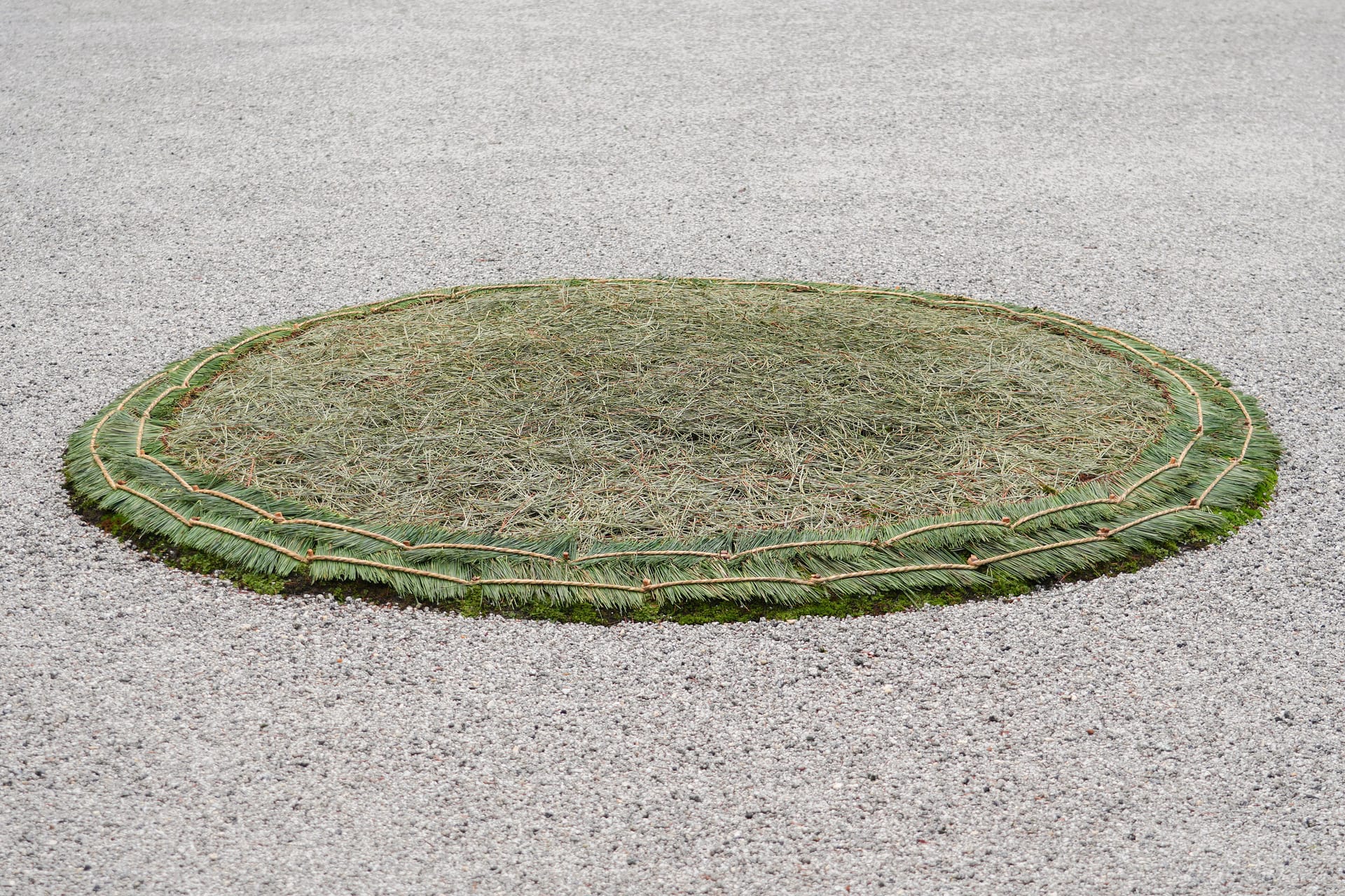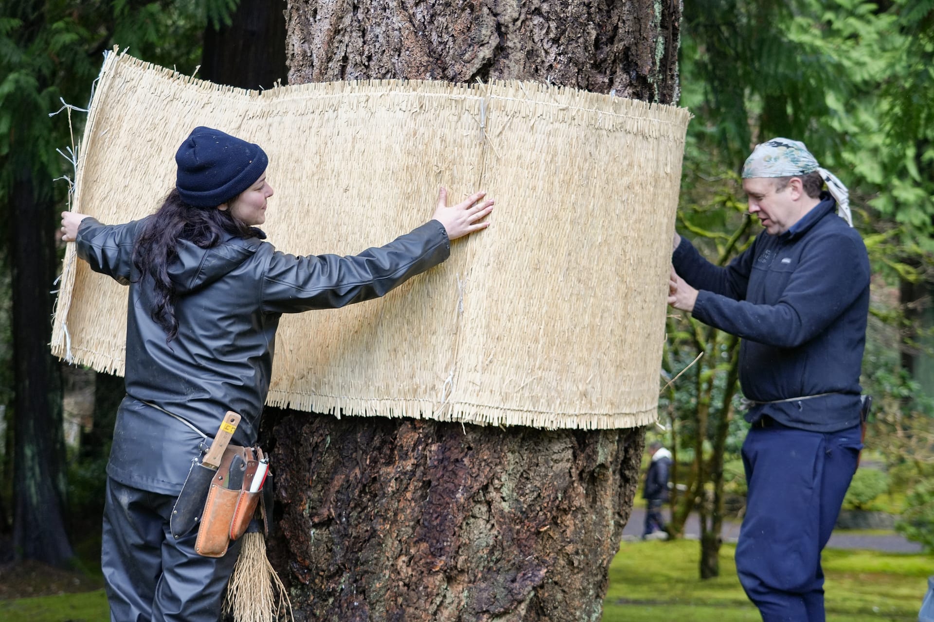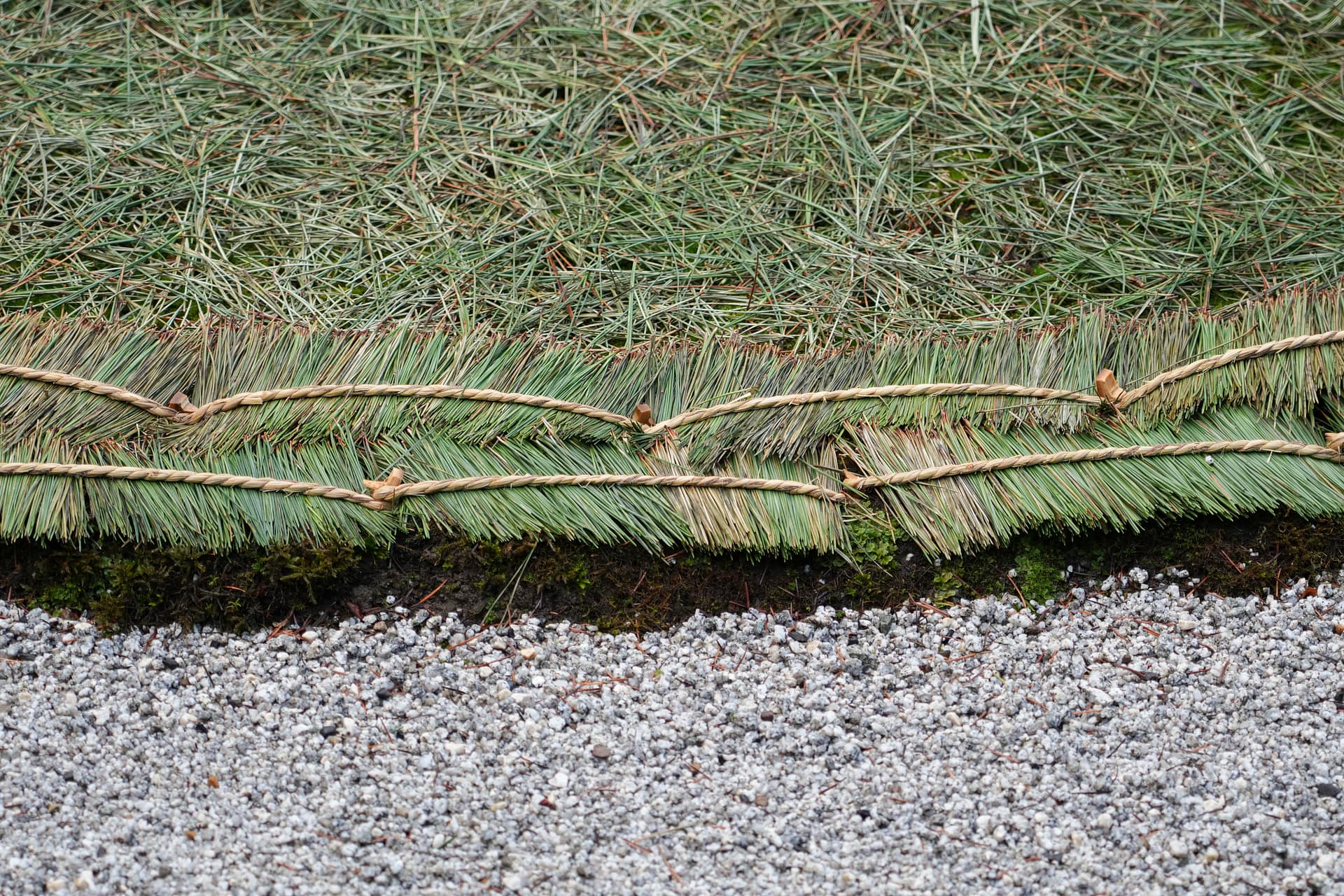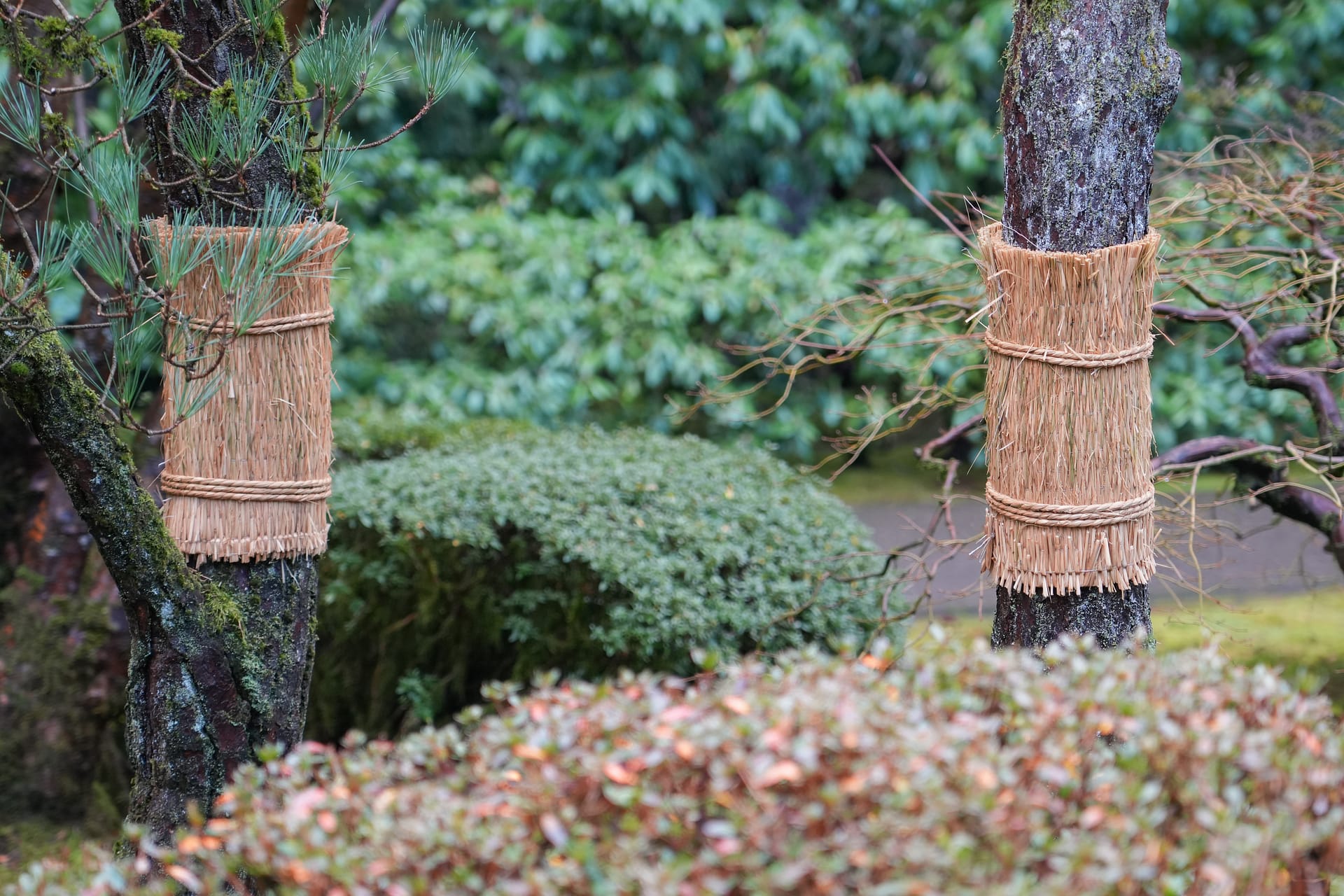 Other notable touches will be added to the landscape this winter. Joining the yukizuri will be komo-maki and shiki-matsuba. Komo-maki are straw mats that are gently wrapped around tree trunks with straw rope. They help prevent insects from descending the upper reaches of the tree and reaching its roots. Shiki-matsuba, meanwhile, are coverings of dried pine needles placed on moss to help protect it from frost. These decorations fit within the idea of tei-en no fuyu-jitaku (庭園の冬支度), which translates to “garden’s winter preparation,” or as Garden Curator Hugo Torii puts it, caring for the plants by keeping them “cozy” in winter.