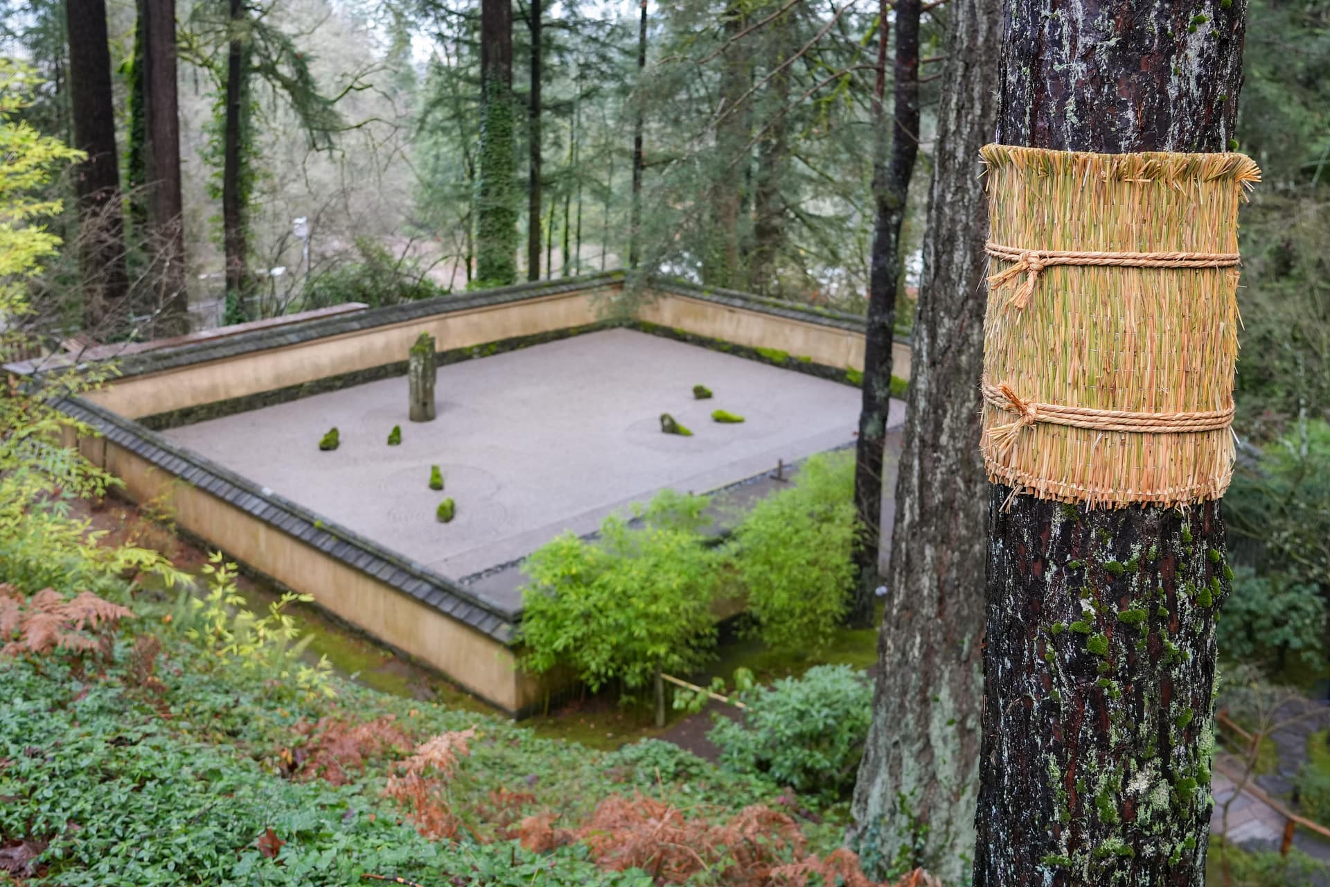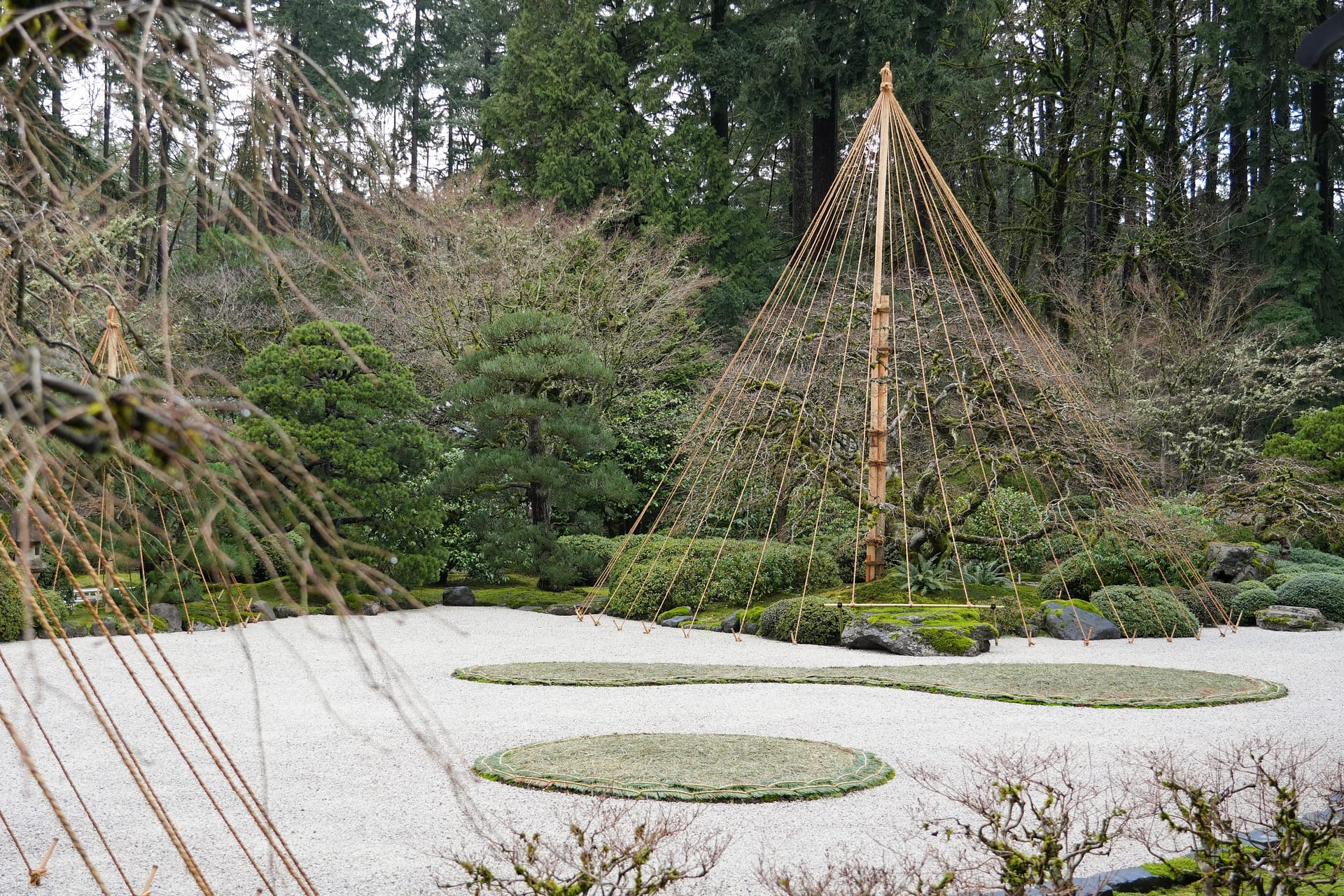 Portland, Oregon has had its fair share of harsh winter weather, including in January 2024, but typically does not see the kind of significant snow accumulation that might cause tree limbs to buckle and undo months of intentionally-done pruning. This means that this technique, a functional need in the snowier regions of Japan, will be more of an aesthetic touch in Portland Japanese Garden. To that end, trees in the Flat Garden, including its weeping cherry and maples, will have yukizuri with ropes tied to spikes driven into the raked gravel. Meanwhile, the other location where yukizuri can be seen, the Cultural Village, has rope tied to the limbs themselves.